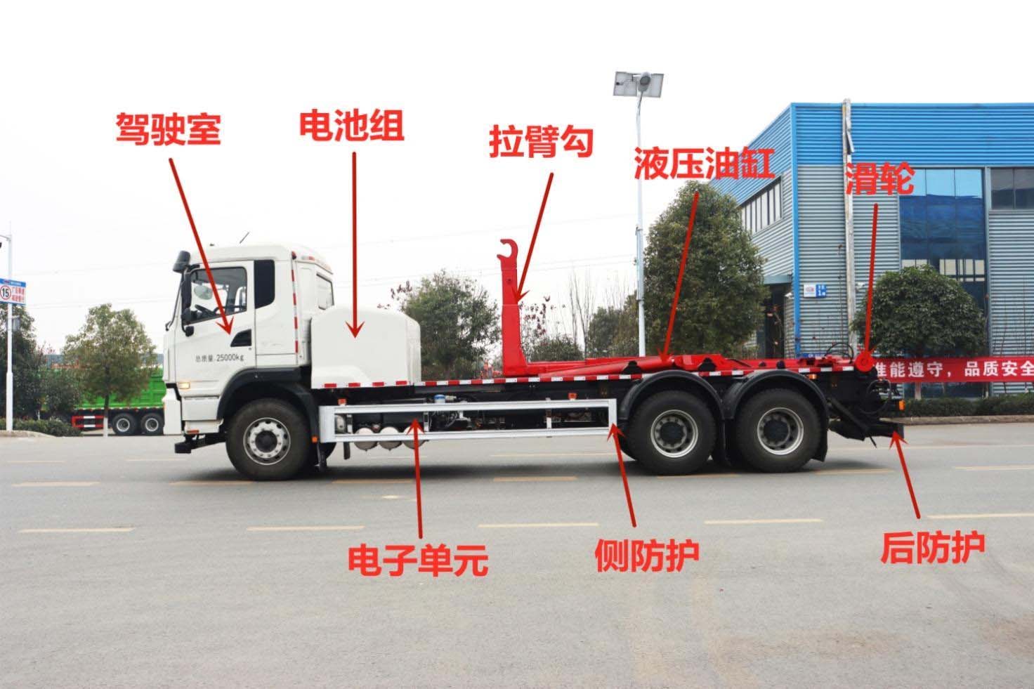 四、其他說明: 純電動車廂可卸式垃圾車是在純電動二類底盤的基礎(chǔ)上,加裝垃圾箱勾臂、液壓系統(tǒng),由機械、液壓 (氣路)、電器三部分合為一體的專用垃圾轉(zhuǎn)運車。