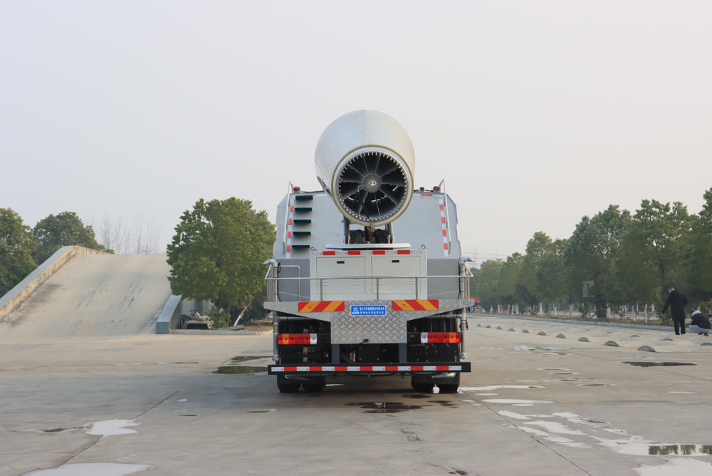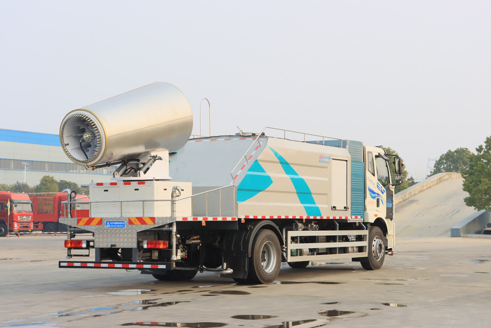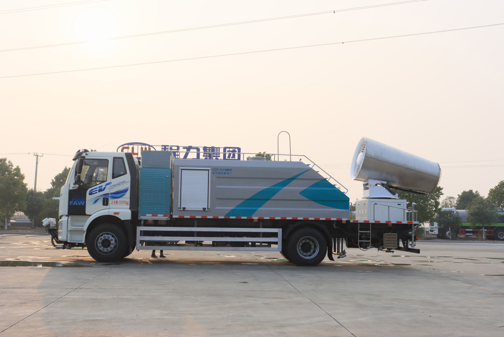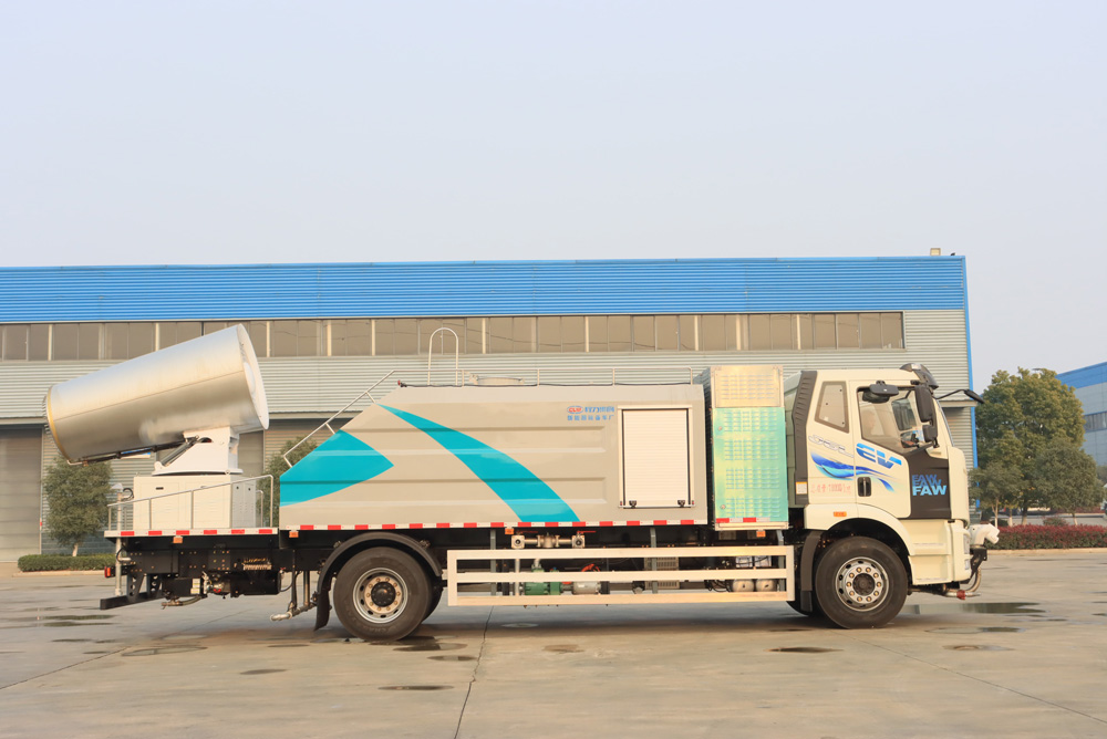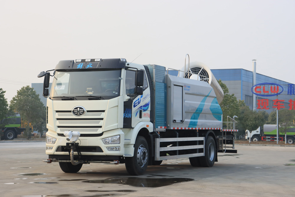 四、其他說明: 解放純電動抑塵車是在純電動二類底盤的基礎上,加裝低壓沖洗、灑水系統(tǒng)、霧炮機組,由機械、液壓(氣路)、電器三部分合為一體的專用灑水作業(yè)車。工作原理:采用自吸式雙級離心泵,效率高、灑水寬度大、水槍射程遠,低壓水泵由底盤變速器取力器通過傳動軸直接傳動。霧炮機組由底盤電池帶動霧炮風扇電機、不銹鋼多級離心泵,進行噴霧降塵工作。