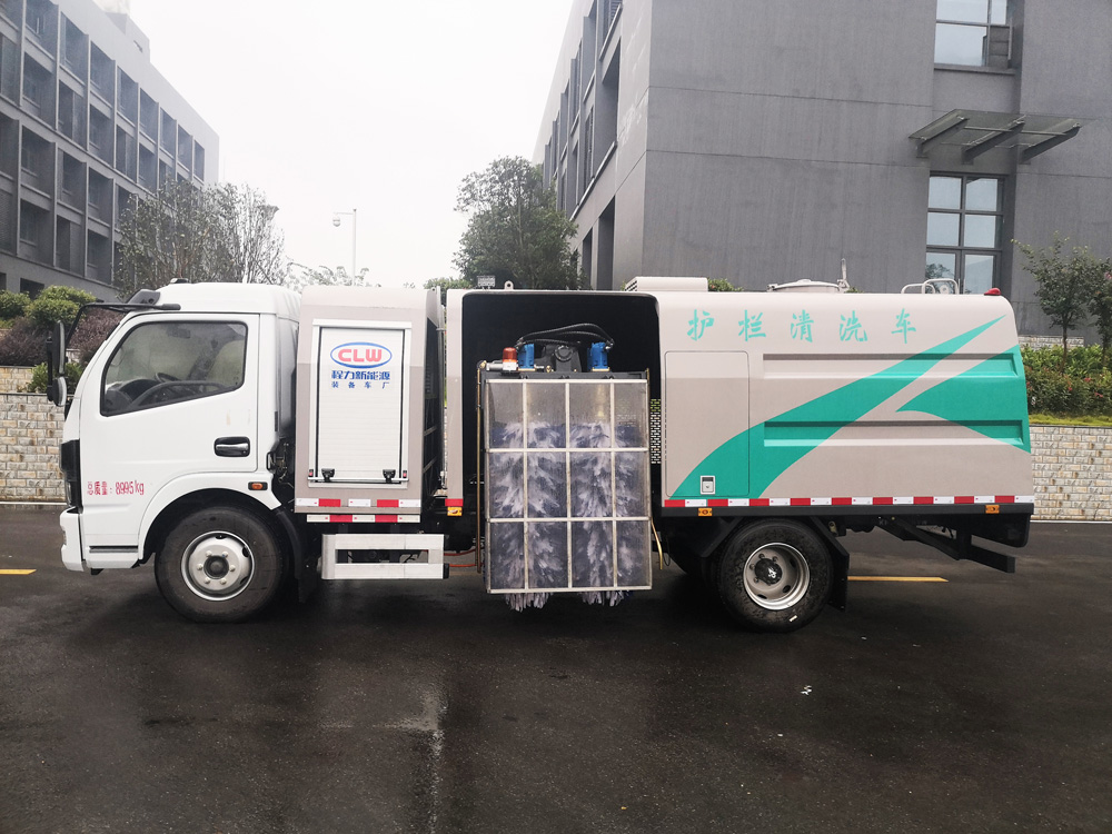 四、其他說明: 東風純電動護欄清洗車,是在標準純電動二類底盤的基礎上,加裝沖洗系統、馬達,清洗刷,由機械、液壓、電器三部分合為一體的專用沖洗作業車。本車具有獨立的水路系統,為清洗車工作提供壓力水源。其工作原理是:利用水泵產生的水,經噴水架的噴嘴噴出,利用電機馬達帶動清洗刷,能將護欄的陳舊污漬清洗干凈;使用高壓噴槍還可清洗路標、廣告牌、高架路等;噴霧系統具有強大的噴霧降塵、噴撒空氣消毒劑及調節空氣濕度功能。
