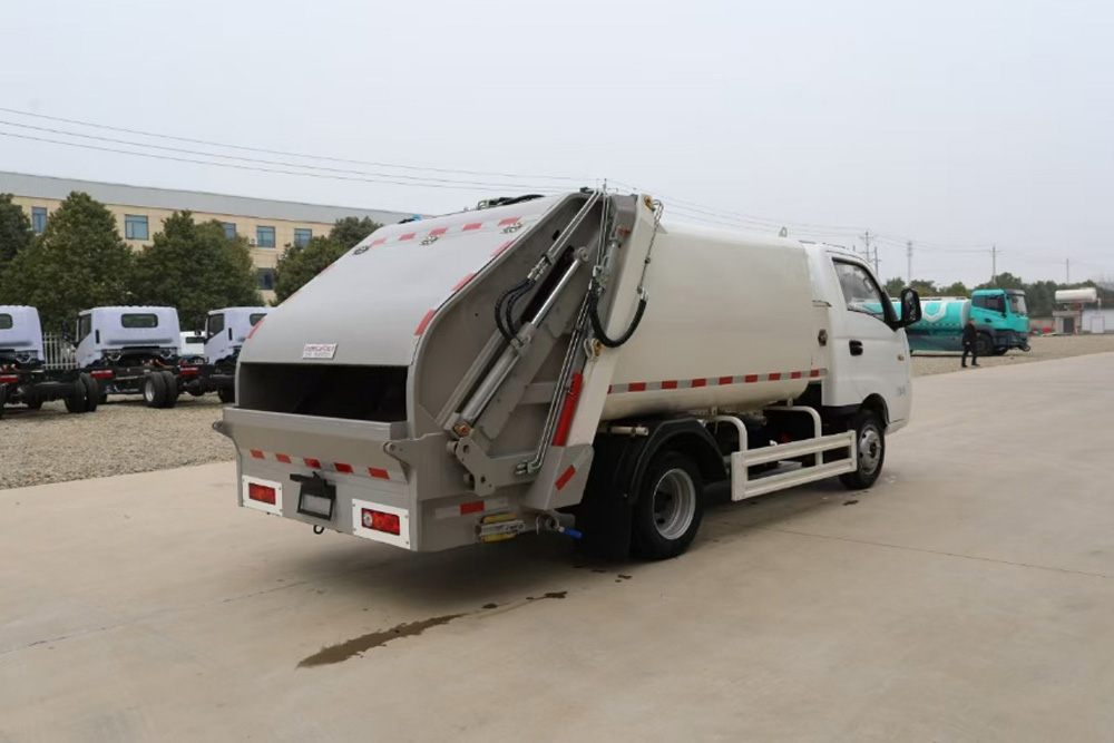 該車特點 涂裝采用噴粉加烤漆工藝。箱體容積3 立方米,為高強度鋼制作的弧形無泄漏船型箱體,頂部有刮滑板,防止垃圾泄漏和異味擴散。液壓系統(tǒng)采用國產(chǎn)油缸、睿宸油泵、揚州中梅多路閥。后帶翻桶架,可掛 2 只國標 240L 方塑料桶,提升機帶無線遙控。填裝器舉升油缸帶平衡閥,帶氣動密封蓋,填充器底部有污水箱,還配備作業(yè)后支腿和電控限位感應系統(tǒng)。