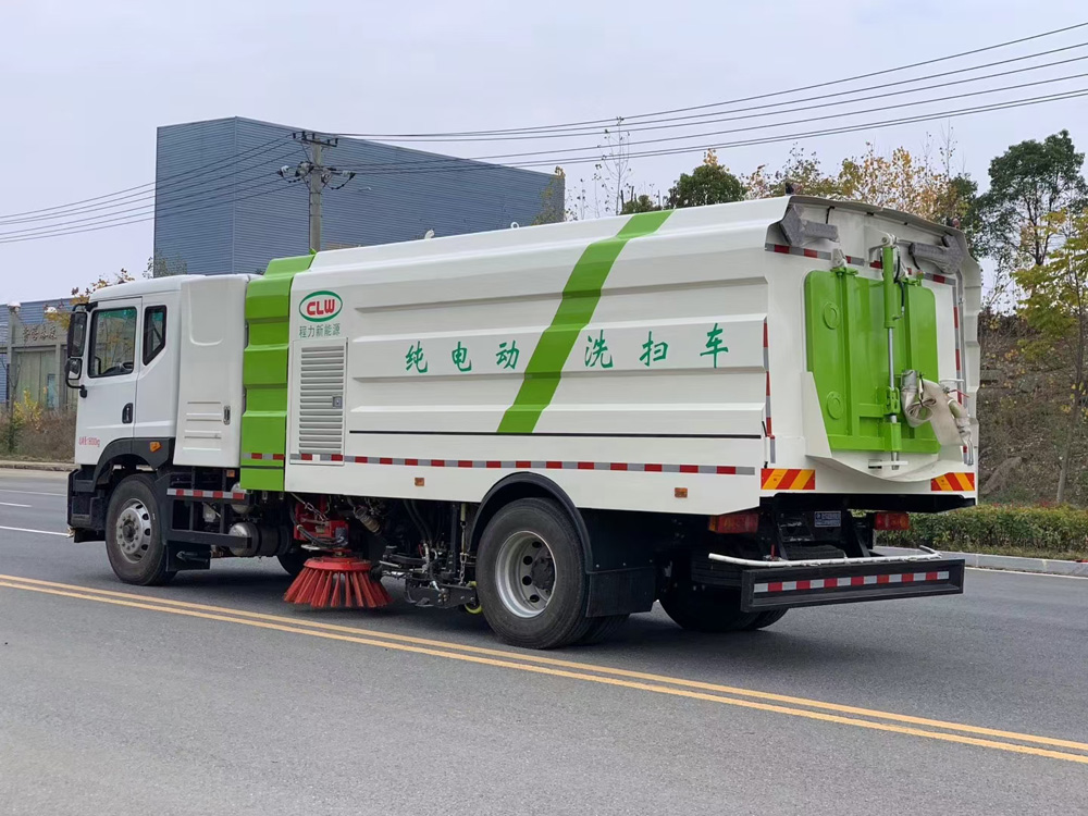 四、其他說明: 方形箱體,大大增加箱體容積,增加整車美觀程度。 底盤電機直接取力,專車專配,完美匹配,無取力器,比柴油車更節省步驟、故障率更低。 洗掃車采用東風純電動二類汽車底盤改裝,加裝風機、高壓水泵、清水箱、垃圾箱、左右立掃、帶噴水桿的寬吸嘴、掃盤降塵系統、液壓系統、專用裝置電控系統和副車架等改裝而成。